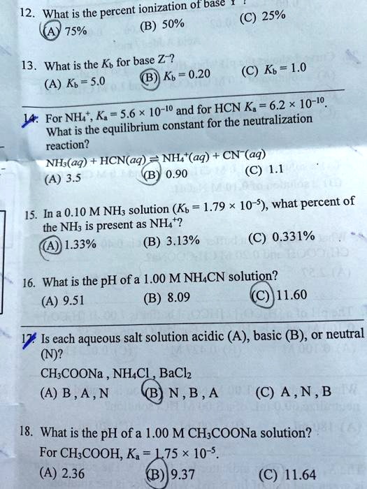 Solved 12 What Is The Percent Ionization Of Base C 25 50 75 13 What Is The Kb For Base Z C Kb 1 0 Kb 0 20 A Kb