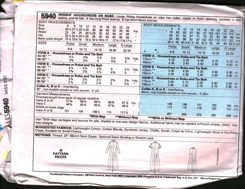 5940 Vintage Mccalls Sewing Pattern Misses Loose Fitting Housedress Robe Casual Ebay
